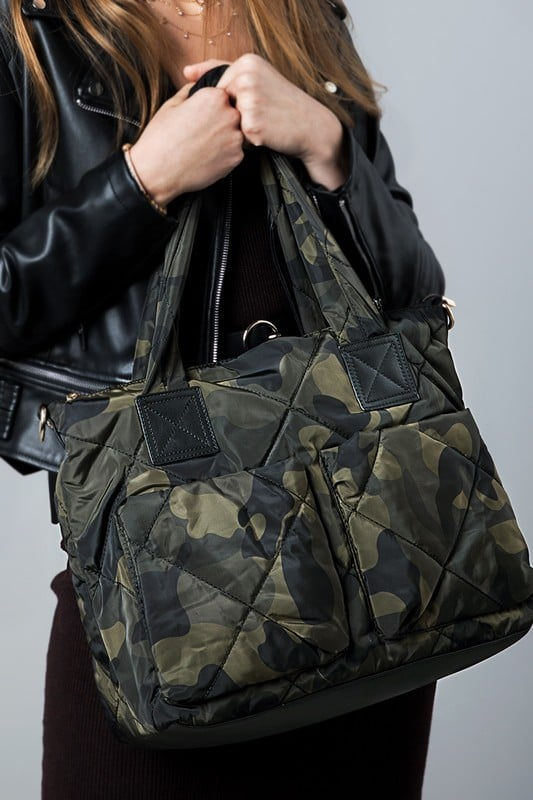 Camo Puffer Shoulder Bag, the perfect accessory for any fashion-forward woman on the go. This stylish bag is designed with a unique camo pattern and features a puffer exterior for added texture and dimension. With plenty of pockets, you'll have ample space to store all your essentials, from your phone and wallet to your makeup and keys. The shoulder strap is adjustable for a comfortable fit, making it easy to carry all day long. Ideal for casual or dressy occasions, this Camo Puffer Shoulder Bag is bound to become your new go-to accessory.