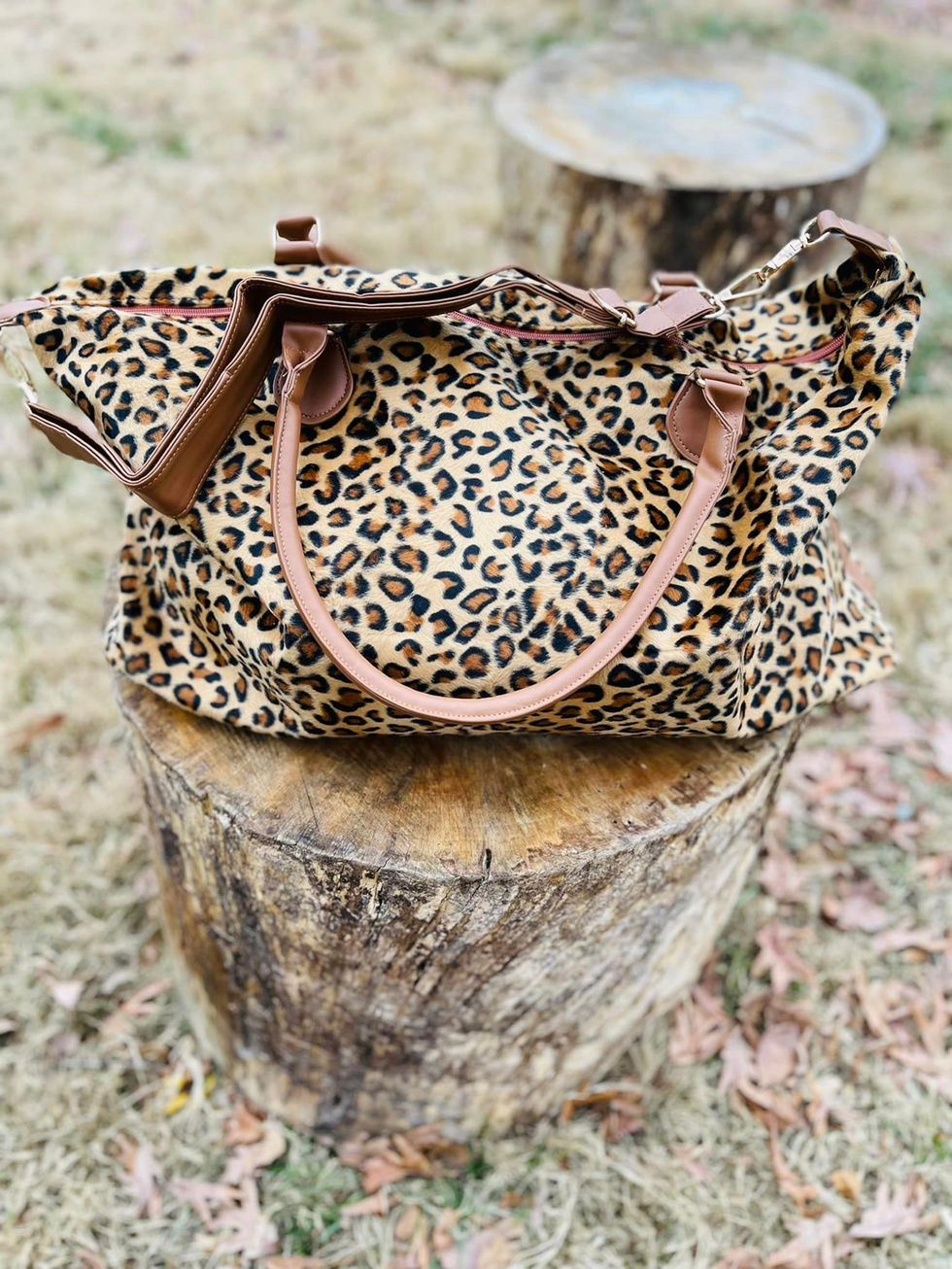 This Faux Fur Leopard Weekender Bag is perfect for your next getaway or weekend trip. The bag features a trendy leopard print design made from soft and luxurious faux fur material. The spacious interior of the bag provides plenty of room for all your essentials, while the sturdy handles make carrying the bag a breeze. Whether you're headed to the beach or a city break, this stylish bag is sure to turn heads. This must-have accessory adds a touch of wild glamour to your travel wardrobe.
